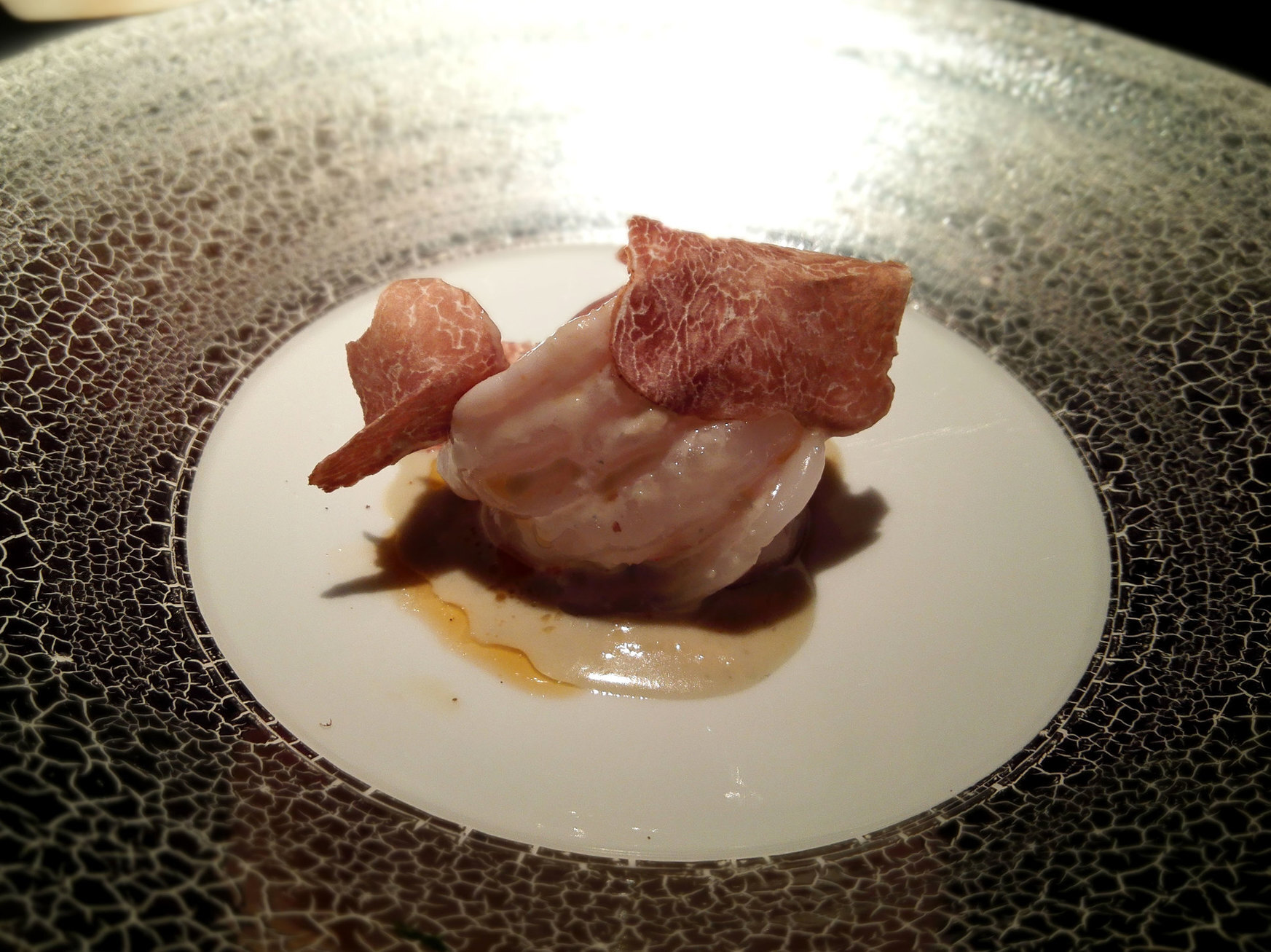 赤座海老のポワレはブルーチーズと白トリュフを使った仕立てだ。トリュフの香りが際立ちながら、ブルーチーズのクセは抑制され香りと味の良い部分だけが引き出されている——これは食材の強い個性を活かしながら悪い部分を排除するという高度な調理判断であり、フレンチの技術の核心の一つだ。絶妙な火入れによる温もりを感じる食感は、火入れの温度管理が素材の旨味の解放タイミングを制御していることを示す。