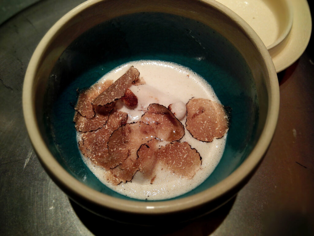 虎ふぐの白子に黒トリュフ。濃厚な白子の旨味にトリュフの香りが重なる。白トリュフと黒トリュフの食べ比べという構成が後半に設けられており、この皿での黒トリュフの体験が比較の基点として機能する。すっぽんのスープ仕立ては賽の目カットのゼラチン質とウズラの卵を内包し、すっぽんの旨味を見事に引き出した濃厚な一椀だ。