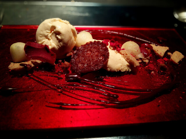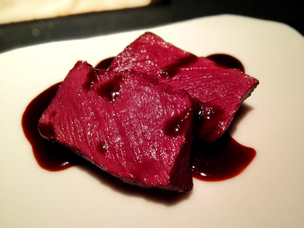 メインは蝦夷鹿を選んだ。上質な柔らかさと躍動的な旨味、フォンドボーとベリー・黒胡椒のソースが絡む。蝦夷鹿という野生の獣肉がフレンチのソースの文法で解釈されるとき、和の食材とフランスの技法の融合が最も明確に現れる。食感と旨味が奇跡的にマッチという評価は、食材の鮮度と熟成、そして火入れの三条件が同時に満たされた状態を指す。