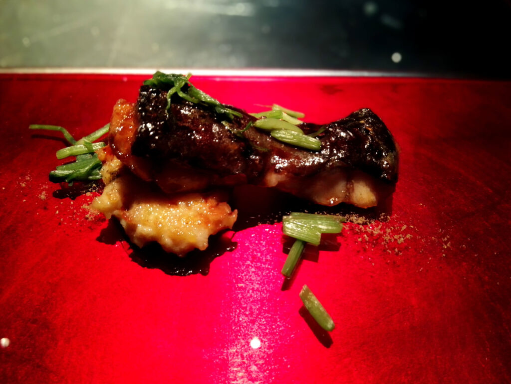 鰻はやげん軟骨・銀杏のガレット・山椒とともに赤く温められたプレートで供される。かりっと焼き上がった皮とふっくらとした身のコントラストは、フレンチの火入れ技術で日本の食材を扱う際の理想的な結果だ。口直しの冷たい麺はフカヒレと香住蟹の旨味に胡麻のスープ風味が効き、冷たい細麺の食感が前後の皿の間に清涼感を挿入する。