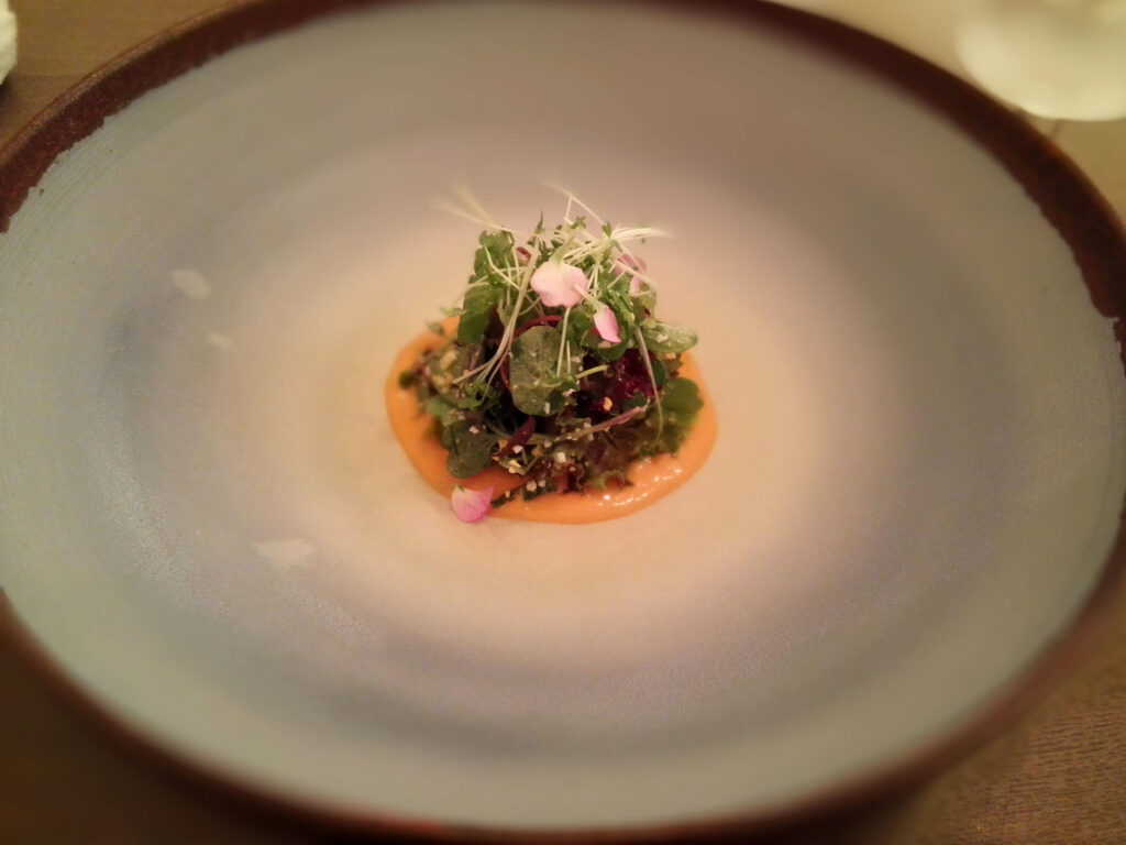 最初の一皿「自然」が、このコースの宣言だ。トマトペーストの赤が太陽を、青い器が空を、茶色い縁取りが土を、中心に配した野菜が草を表す。ハーブ含む30種のサラダが、器という絵画の中に収まっている。皿の設計がロジカルに計算されているという事実は、料理が味覚だけを対象としていないことを意味する。視覚・感性・知性を同時に動員させる構造で、この一皿がコース全体の鑑賞モードを設定する。
