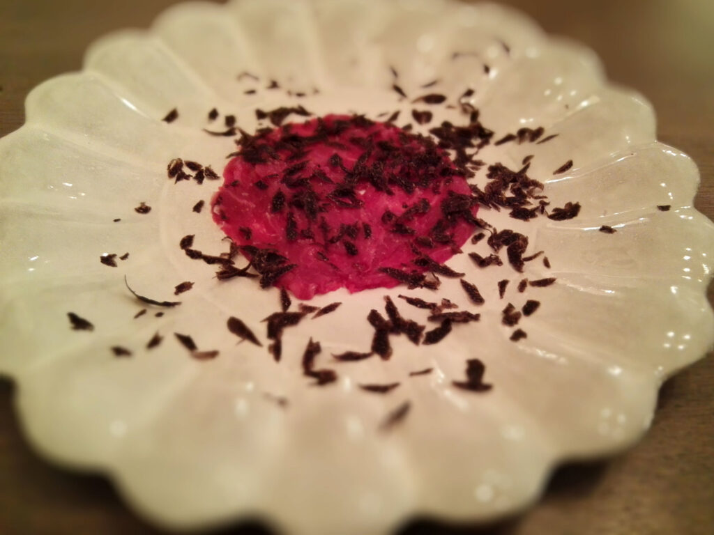 「体温」と名付けられた皿——生きている牛の体温と同じ温度で提供される見島未経産牛とトリュフ。見島牛は西洋牛の血が入っていない日本在来種であり、通常は生提供されない部位を生で供する。温度管理が食感の設計であり、食感の設計が素材の本質への接近手段だという論理が、皿名に凝縮されている。噛みしめるほどに味が滲み出る肉の旨味は、加熱が調理の唯一の手段ではないという問いを静かに投げかけてくる。