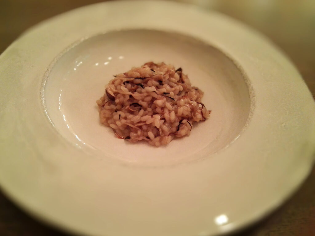 ボニュの料理設計は、足し算より引き算の方向に働く。素材に付加価値を「盛る」のではなく、素材が本来持つ価値を遮るものを取り除くという方向性だ。水・塩・オリーブオイルだけで仕立てるリゾット、小麦と水と塩だけのパン、生産者との直接関係によって初めて調達できる見島牛——これらは資本投下で複製できない。
