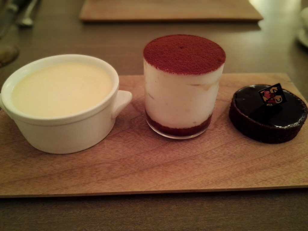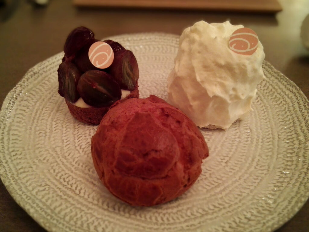 巨峰の果肉・皮・種すべてを使ったタルト、水とショコラとタルト生地のみのタルトショコラ、生クリーム不使用のシュー・ア・ラ・クレーム、全卵・ミルク・グラニュー糖のみのプリン。デセールの各品においても、素材の個性を最大化するために余分なものを加えないという一貫した思想が貫かれている。パティスリーの技術とはグルマンディーズを満たすものだという前提を、静かに更新してくる構成だ。