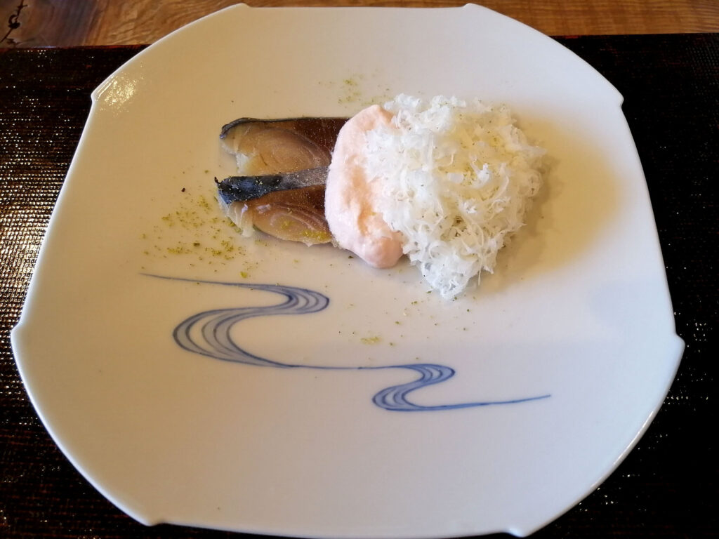 鯖の熟れ寿司にカチョカヴァロとトマトのソースを合わせた一品は、この店の思想が最も鮮明に現れる皿だ。発酵という日本の伝統技法とイタリアの素材の組み合わせは、一見して奇抜に映るが、口に入れた瞬間に必然として成立する。山椒のピリッとした重なりが、発酵の酸味・カチョカヴァロの濃厚さ・トマトの酸味という三つの強い個性を一点に引き締める。奇抜なようで綿密に計算された、という評価の核心がここにある。