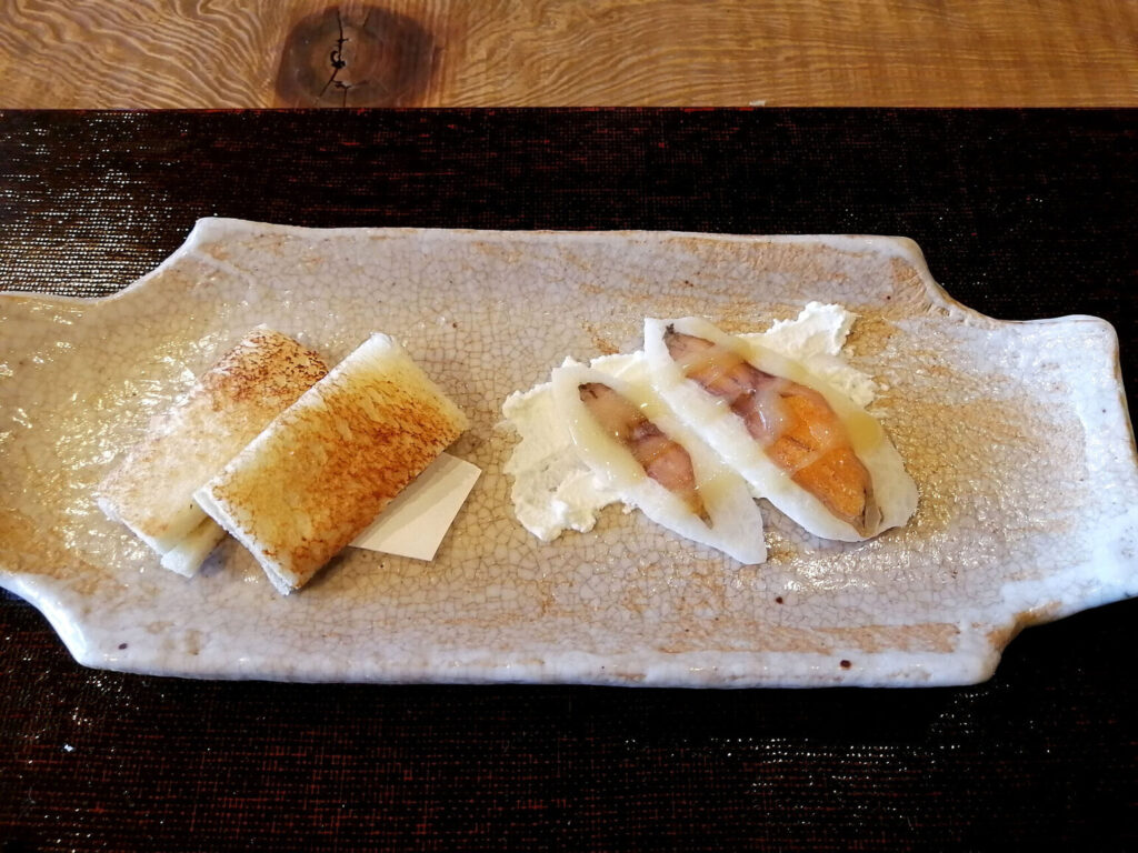 鯉のお造りは鮒の卵をまぶして供される。コリッとした食感と適度な柔らかさの共存は、鮮度と包丁の両方の精度を要求する。淡水魚の造りを成立させるためのハードルを、素材の調達と技術の双方でクリアしている一品だ。