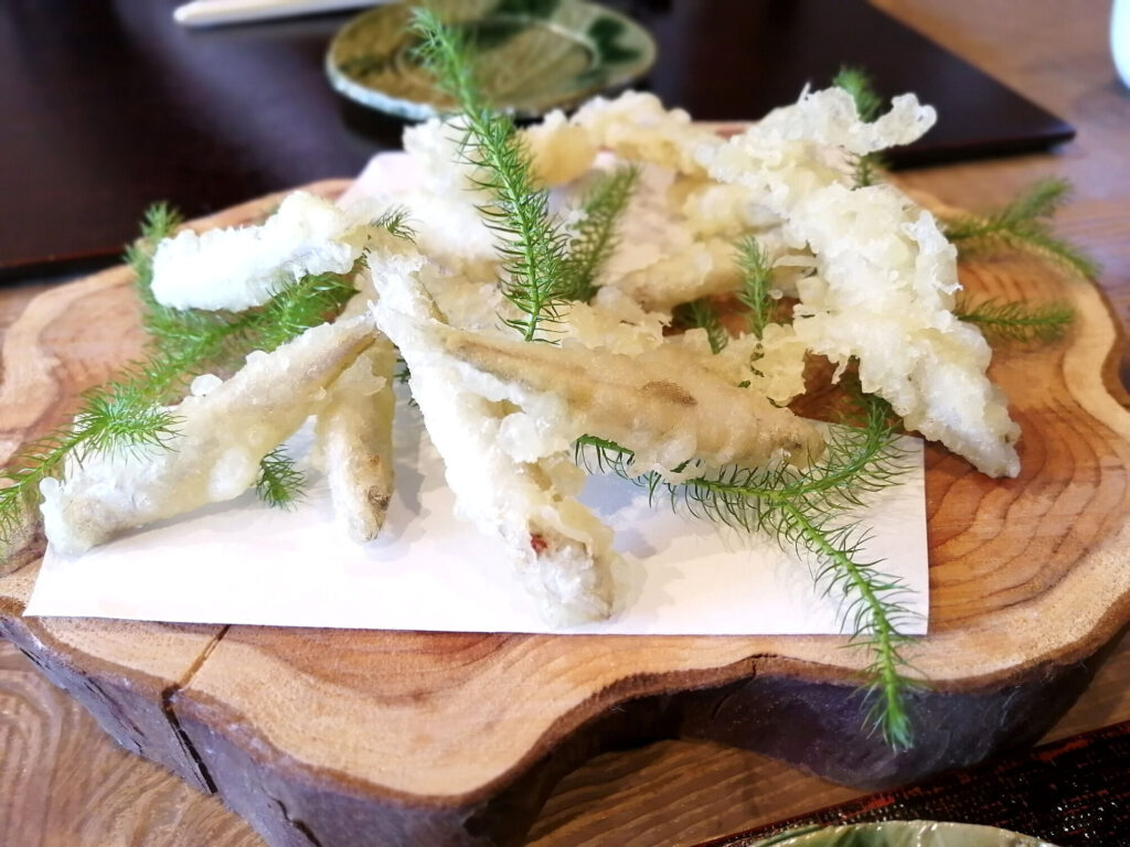 鰻の飯蒸しは上品な餡が全体を束ねる。鰻ともち米に絶妙に合う餡の丁寧な仕上がりは、他の皿にも転用したいと思わせるほどの完成度だった。ワカサギの天ぷらは藻をすり抜けながら湖を泳ぐような姿で揚がっている。揚げ物において素材の動きを封じ込めるという描写は、温度管理と揚げ時間の精密さを示している。