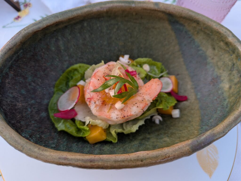 タイガープロンサラダはプリッとした海老と熟れたマンゴーが甘酸っぱく調和し、香草の香りが爽やかに抜ける。海老とマンゴーという南国の感性による素材の組み合わせは、東南アジアの味の文脈をフレンチのサラダ形式で解釈した一皿だ。ドレッシングの酸味と果実味のバランスが完璧という評価は、この組み合わせの論理的な正しさが感覚として届いた状態を示す。
