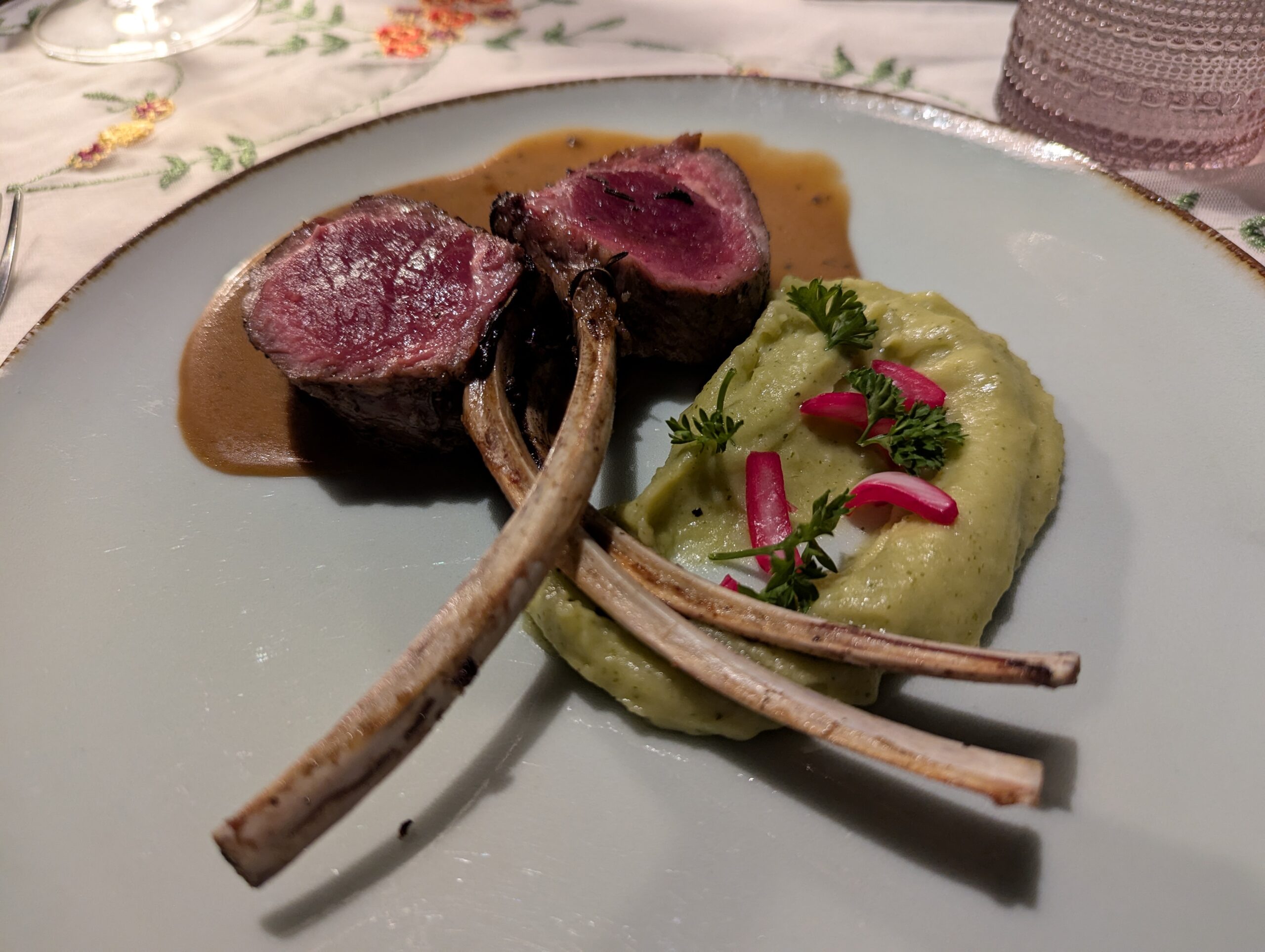 オーストラリア産ラムラックは骨付きのままじっくり火入れされ、外の香ばしさと中のピンク色が対比をなす。ラム特有の香りが抑えられた状態は、下処理と火入れの精度が素材の個性を制御した結果だ。マッシュポテトとハーブソースがリゾートでいただく肉料理の完成度を支える。チョコ&ナッツのプレートは濃厚なチョコレートムースにバナナとマンゴーのチャツネ、クロカンが重なる——南国の甘みがフレンチのデセールの文脈に収まり、地域性と形式の融合がデザートまで貫かれている。