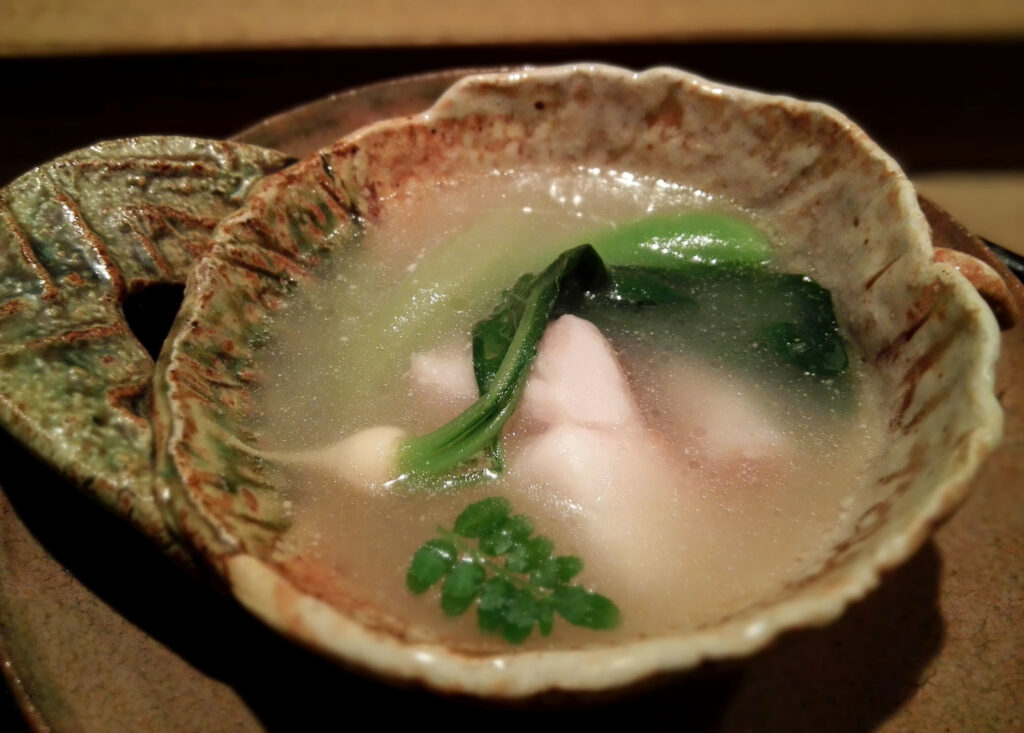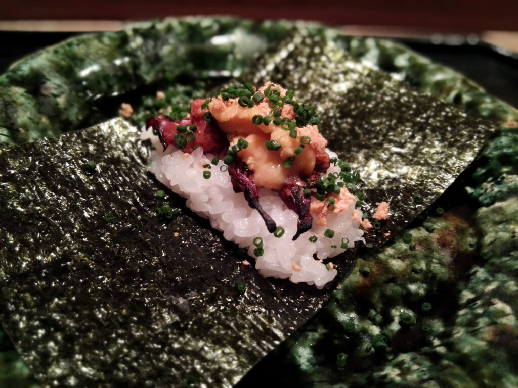 炭焼きホタルイカにウニを合わせたもち米の海苔巻きは、このコースの核心に位置する一品だ。炭火の香り、もち米の食感、ウニの濃密なアクセント——三要素が重なって深みのある味わいを生む。鰹出汁にくゆらせたホタルイカという下処理の段階から、最終的な一口の体験まで、工程の全体が一点に向かって設計されている。