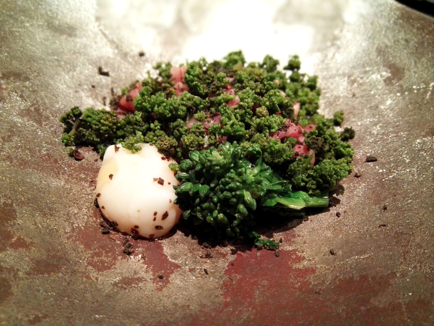 すっぽんの煮こごり、のどぐろと続き、焼き菜の花と牛肉にうずらの温泉卵と花山椒が添わる。後を引く味わいとはこういう状態を指す——口を離れた後も、素材の余韻が続く皿だ。キンキとカブのすり流しは、この時期にしては脂の乗りが際立つキンキと、口当たりの良いすり流しが相乗効果を生んでいた。