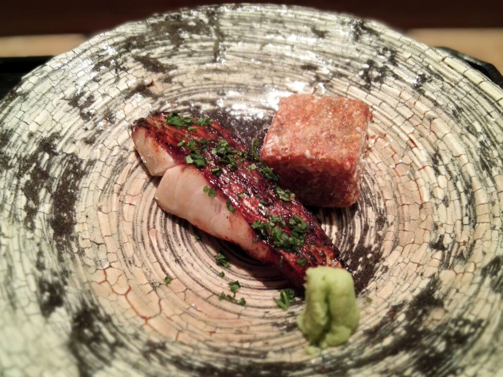 金目鯛のお造りは、軽く炙った身を濃厚な出汁のジュレが包む。極限まで薄くスライスした茗荷は食感も香りも通常の範疇を超えており、脇役であるはずの素材が主役と対等な仕事をしている。この種の「脇役の精度」が、コース全体の水準を底上げする。