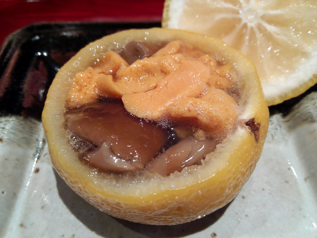 すっぽんはタレで、青首鴨は塩で——一つの器に二品が収まる。タレと塩という対照的な味の方向性が、同じ器の中で主張し合わずに並立する。柚子釜の中になめこと雲丹が入った一品は、香りが先に届く。素材の組み合わせより、柚子という器の選択が体験の軸を決めている。