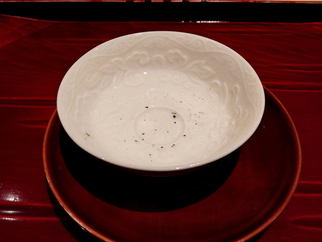 椀は松葉ガニの真薯・青味大根・柚子皮。蟹真薯の旨味、柚子皮の香り、ほんのり甘みのある青味大根——三要素が極上の出汁の中で干渉し合わずに役割を分担している。出汁の中に複数の個性を収めながら調和を保つという技法は、椀という形式の本質への理解を要求する。
