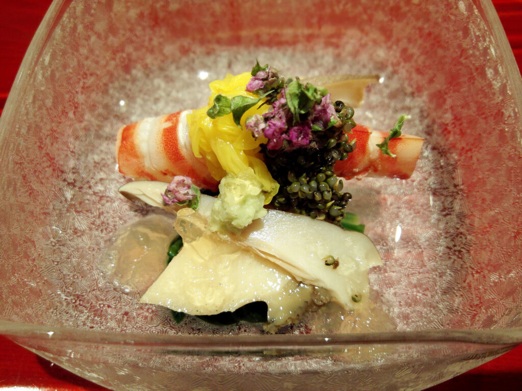 先付けから目を見張る密度だ。蝦夷アワビ・海老・キャビア・椎茸・菊菜・ジュレ・紫蘇の花・子持ち昆布が色合いと味わいを多層に重ねる。蝦夷アワビの旨味が軸となりながら、周囲の素材がそれぞれの個性を保って共存している。一品目でこの密度を置くことは、コース全体への信頼を冒頭で確立する設計だ。