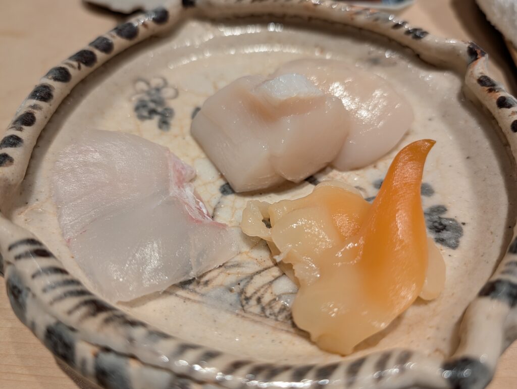 - ひらめ・あおやぎ・ホタテのお造り。身質の選定精度が高く、三種それぞれの食感と旨味の差分が際立つ。