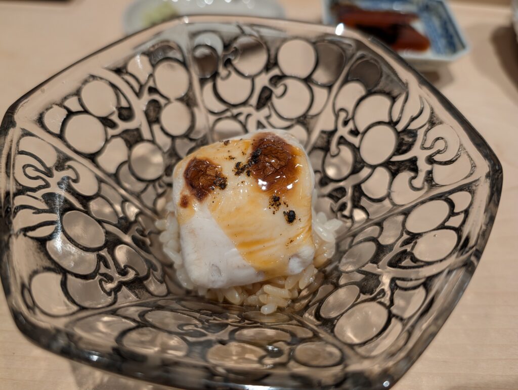 - とらふぐの焼き白子丼。炭火焼き白子・卵黄・ご飯という、旨味の三重構造。記憶に刻まれる一品だ。