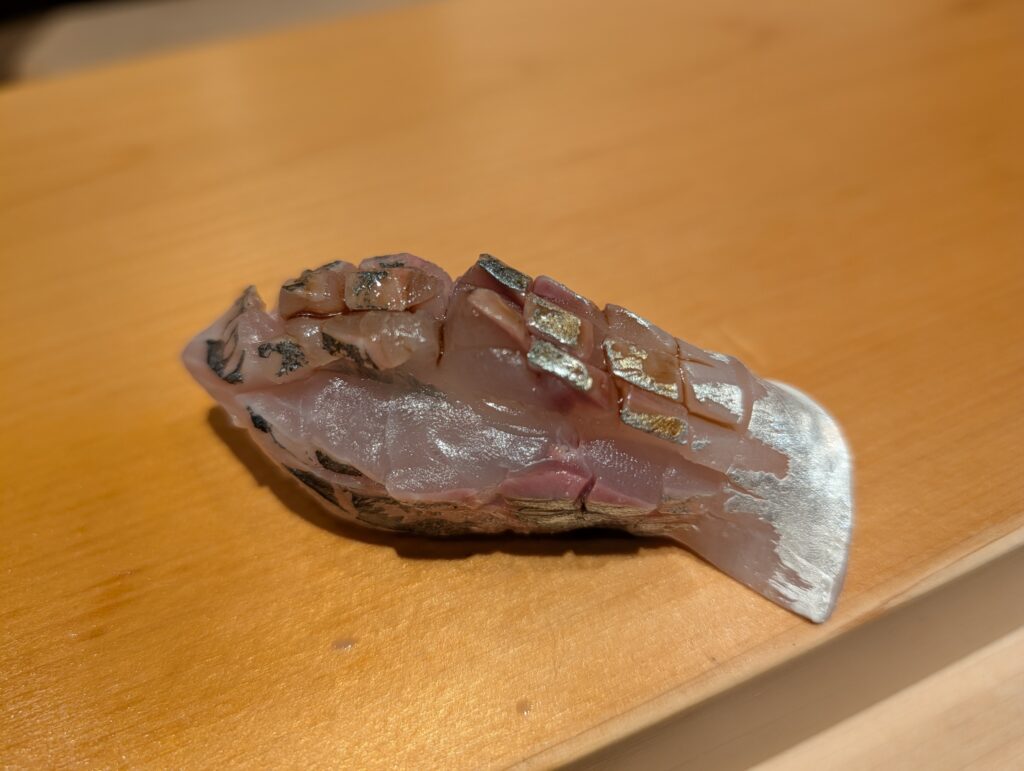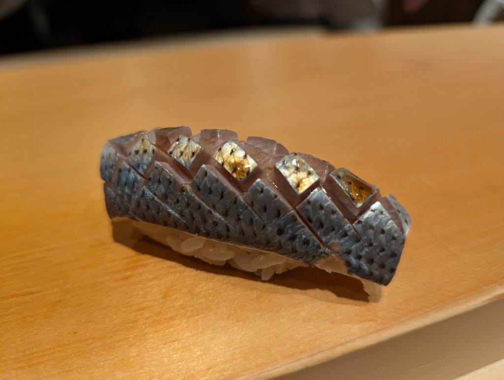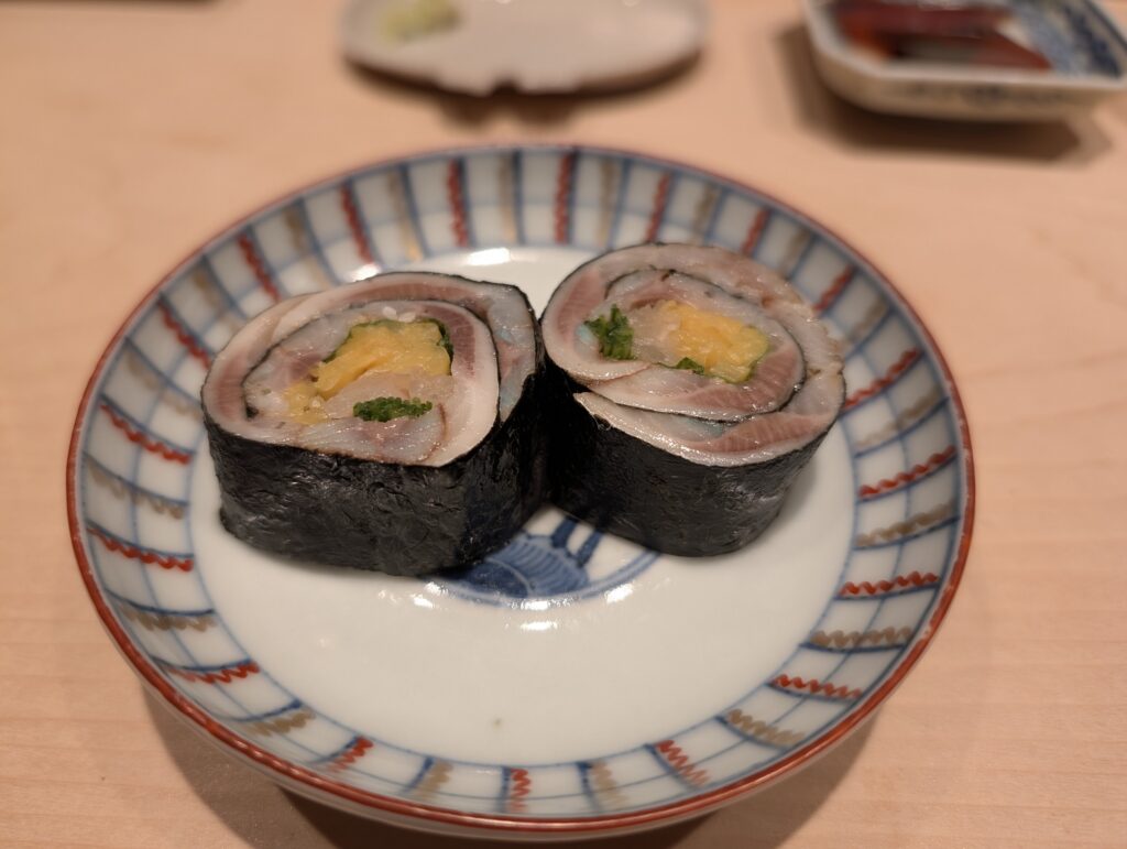 - イワシの海苔巻き(ガリ・芽葱・大葉入り、わさび/塩/醤油を選択)。香りの設計が突出しており、コース全体を通じて最も「職人の意図」を感じた料理の一つ。
