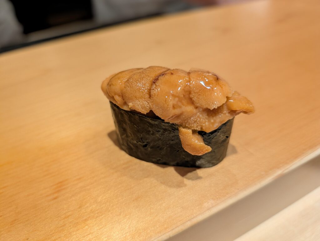 - 金目鯛・アジ・馬糞雲丹・車海老・大トロ・穴子と続き、玉子焼きを経てしじみのお椀で着地。