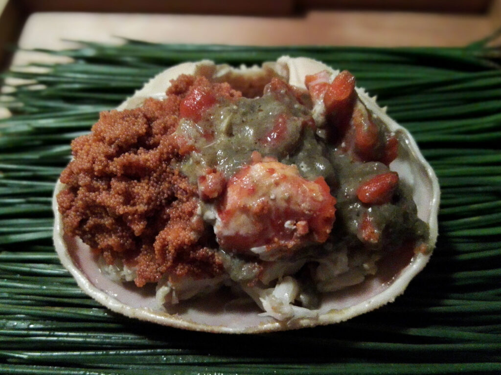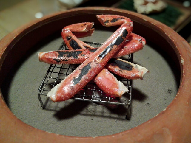 冒頭、間人蟹がお披露目される。甲羅盛には蟹味噌・内子・外子・ほぐし身が一堂に会し、焼き蟹がそれに続く。一種の食材が持つあらゆる味の断面を、コース冒頭で俯瞰させるという演出は、主題の宣言として機能する。素材の格が厨房の格を担保するのではなく、厨房の格が素材の格を引き出すという順序を、この一皿が証明していた。