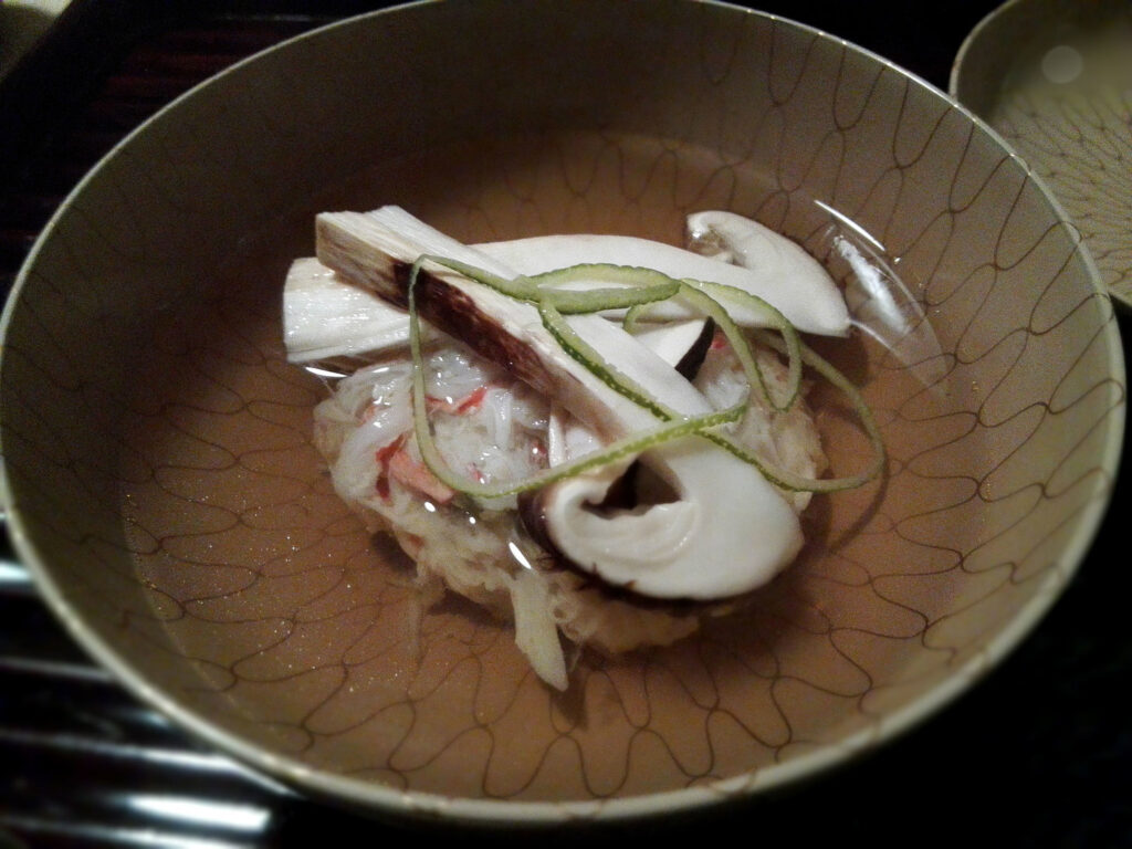 松茸の椀が、この夜を一段高い場所へ連れていった。京都丹波産の松茸は蟹真薯の上に据えられ、出汁に浸らない高さに置かれている。香りの揮発を守りながら、真薯は出汁の中に潜って旨味を湛える——香りと味を空間的に分離しながら一椀に収めるという技法は、構造設計の話である。料理を口に含む前から、視覚と嗅覚が先行して体験を始めている。