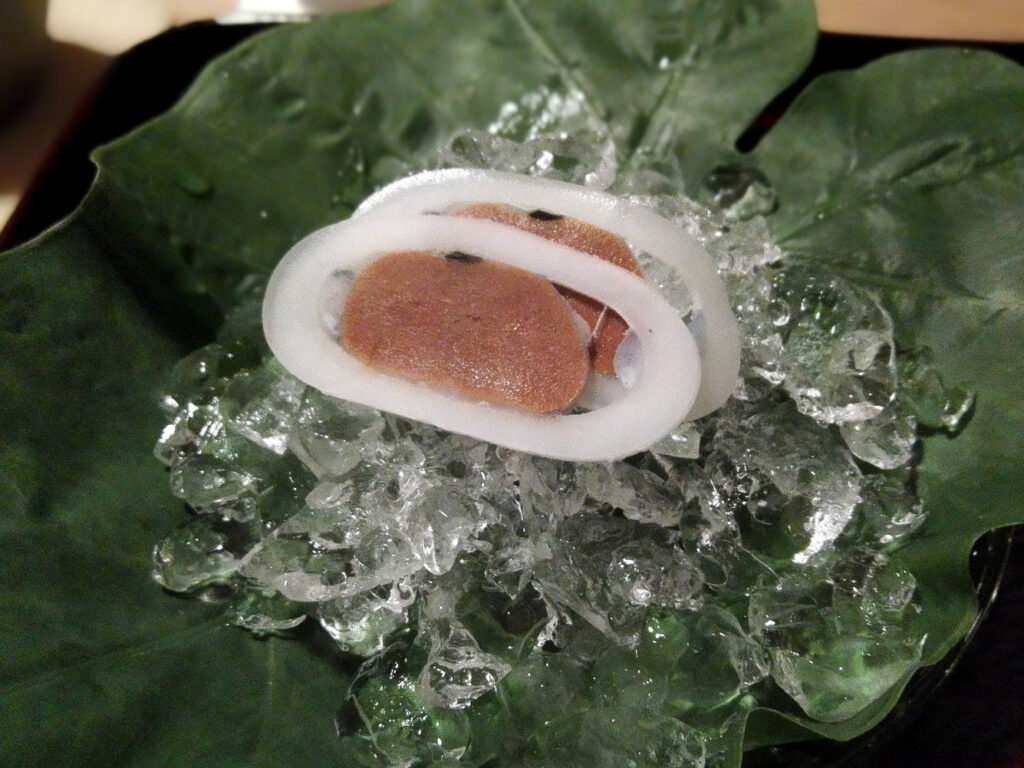 唐墨と辛味大根の中に餅が忍ばせてある。唐墨単体でも水準は突出しているが、餅が旨味に厚みの層を一枚加える。こうした「一皿ごとの仕掛け」の密度が、食べ進めるほど筆者のROI感覚を静かに狂わせていく。